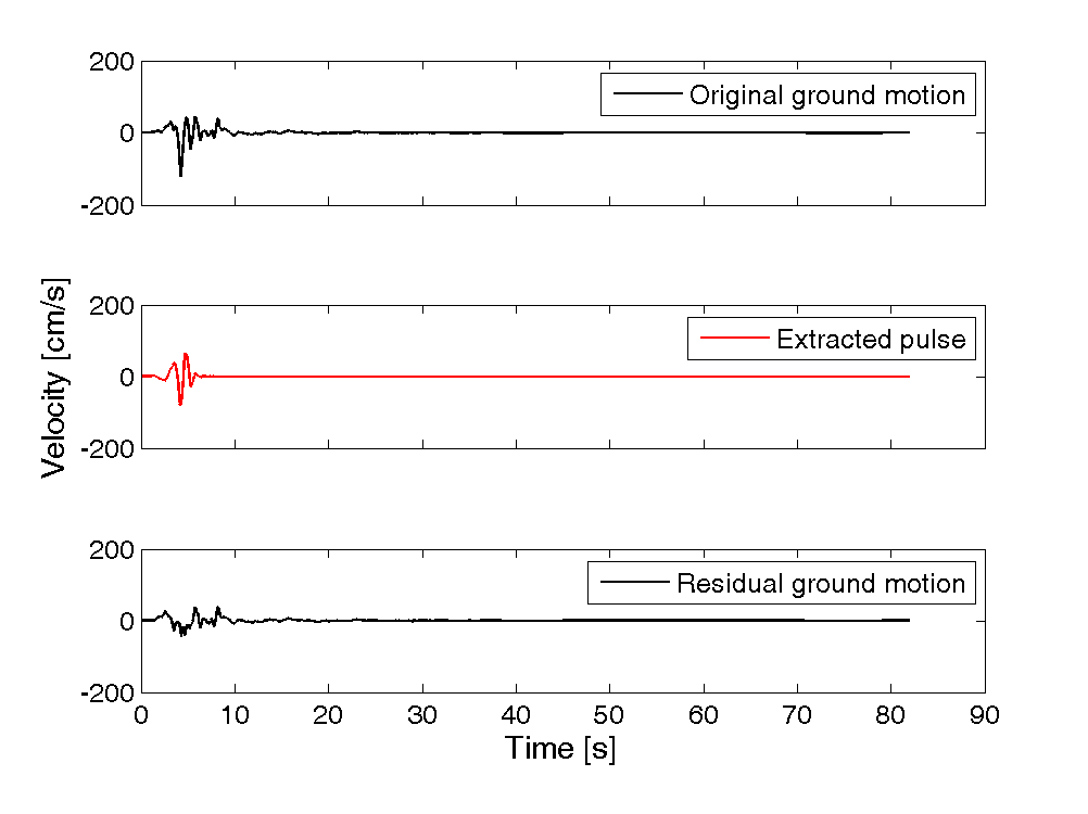 Plots of original ground motion, extracted pulse, and residual ground motion: